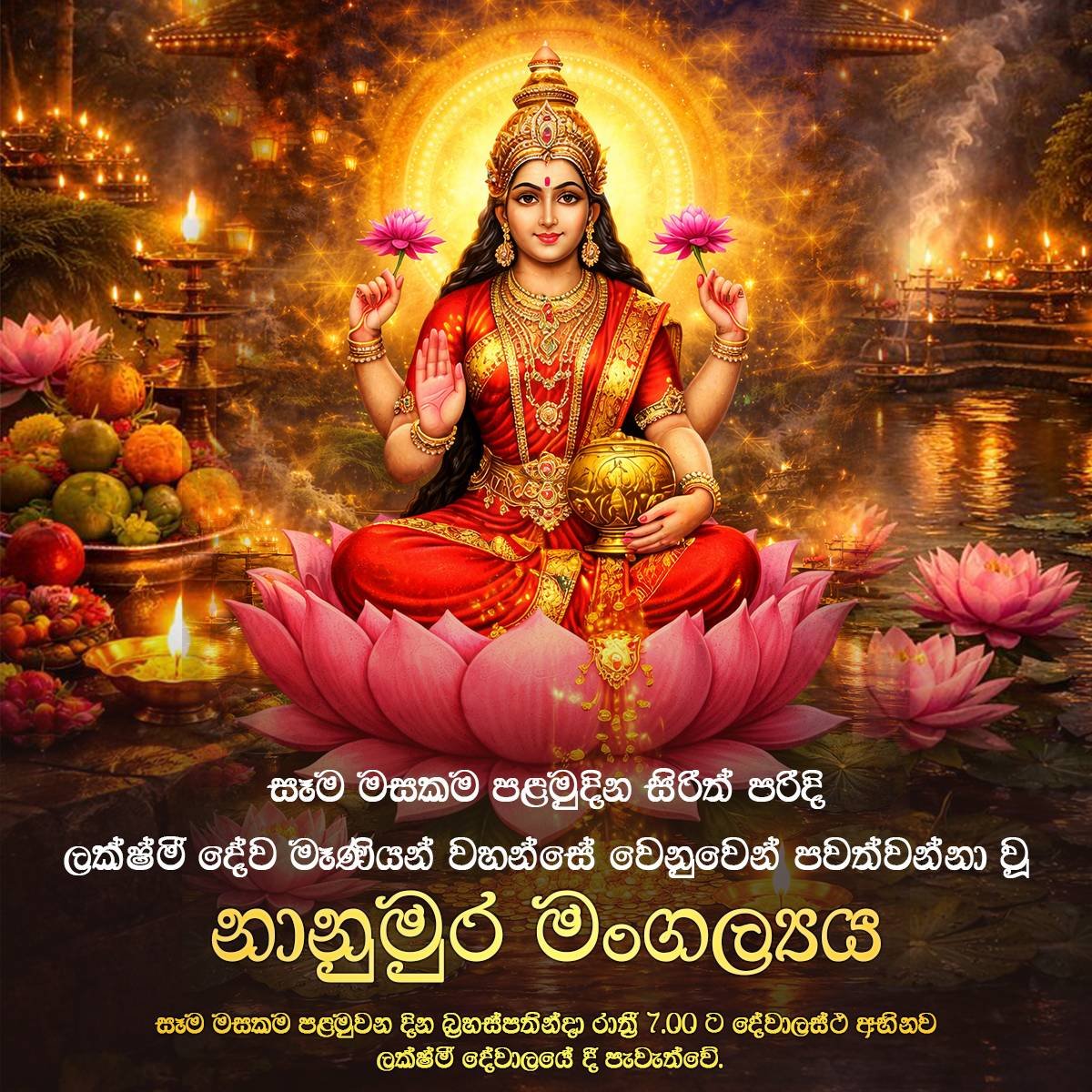 - සෑම මසකම පළමුවන දින සවස 7.00 ට ලක්ෂ්මී පූජාව පැවැත්වේ.